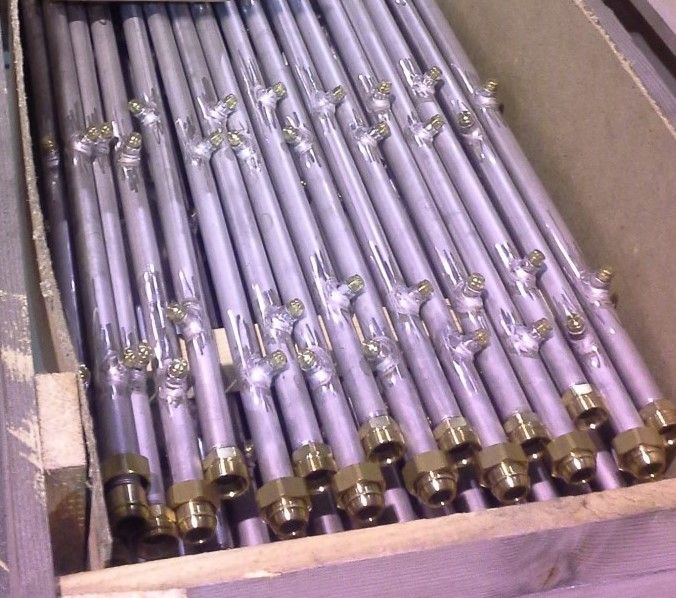 Dessa spridarrör tillverkas i rostfritt stål och i ändarna monterar vi unionskopplingar för att de ska bli enkla att ansluta till varandra. Varje spridarrör är ca 2m långt och det finns där plats med 7 eller 10st dysor.