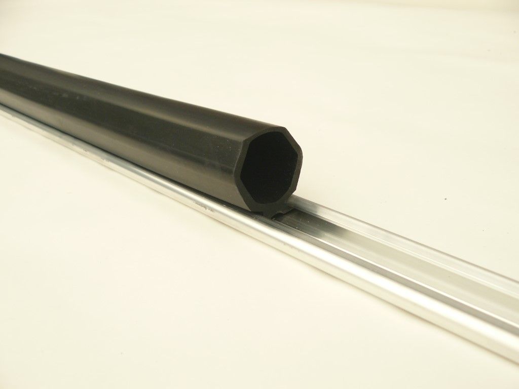 Som extra säkerhet mot kommande läckage tejpas fogarna även med en butyltejp. För tätning mellan porten och karmen nitas först aluminiumprofiler i en form av bokstaven ”C” och i den träs en gummipackning som är tillverkat av EPDM gummi. I hörnen använder vi porthörn, helgjutna i EPDM gummi i lämplig hårdhet.