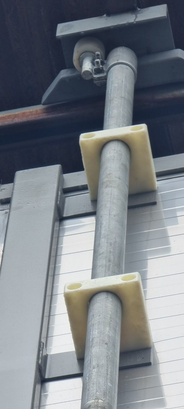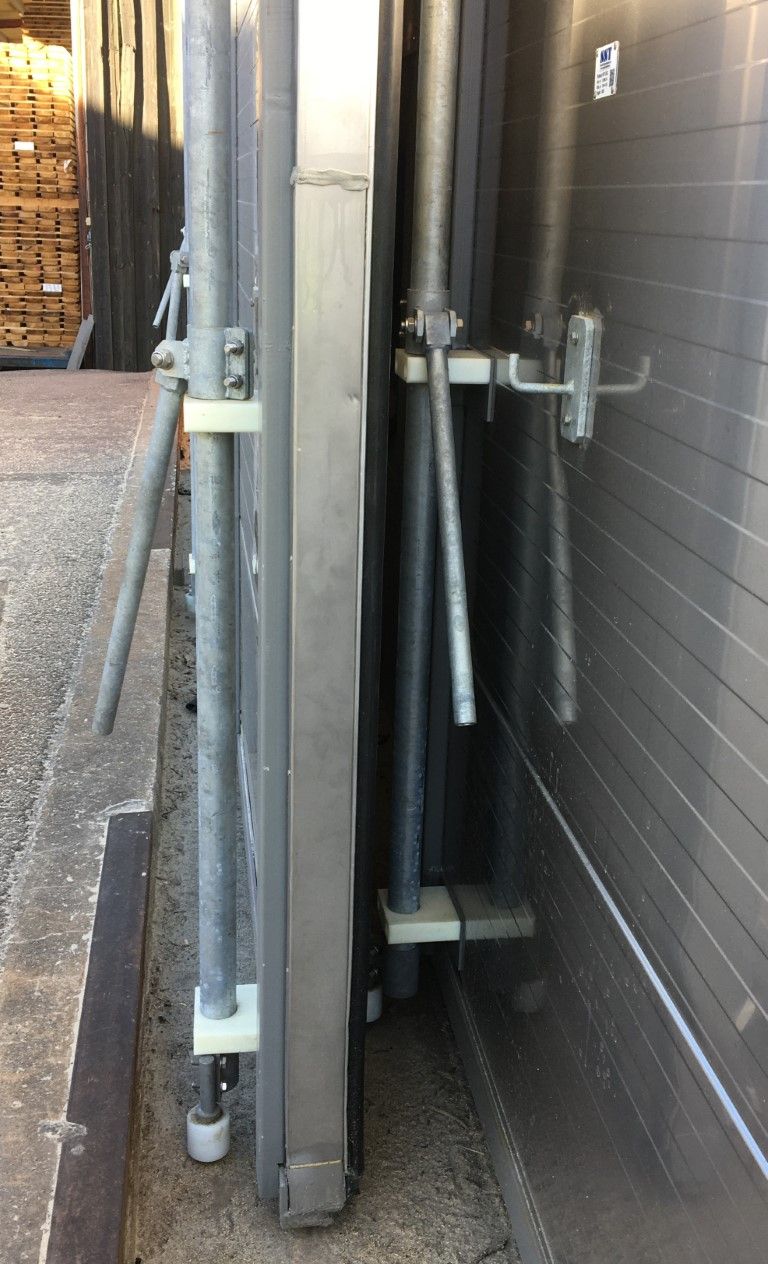 Denna portmodell tätas genom att den pressas inåt av de vertikala runda galvade rören och i över- och underkanten finns det svep med en plastrulle på som pressar porten emot karmen. Eftersom det inte finns något stöd på sidorna behöver denna port vara lite speciellt konstruerad och vara stigande extra kraftig på sidorna beroende på portens höjd.