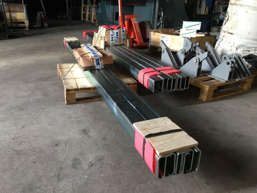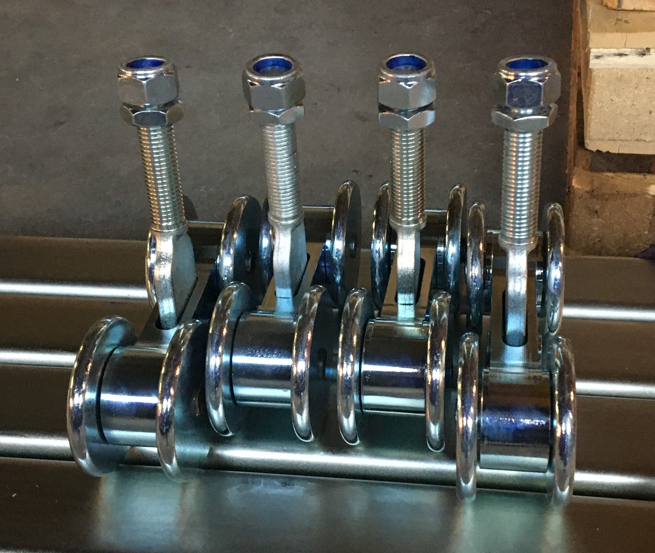 Hängskenor används till den portmodell som vi kallar för excenteransättarport. Den svetsas fast i konsoler ovanför porten och i den löper hängrullar som ansluts till hängslen som i sin tur ansluts till porten.