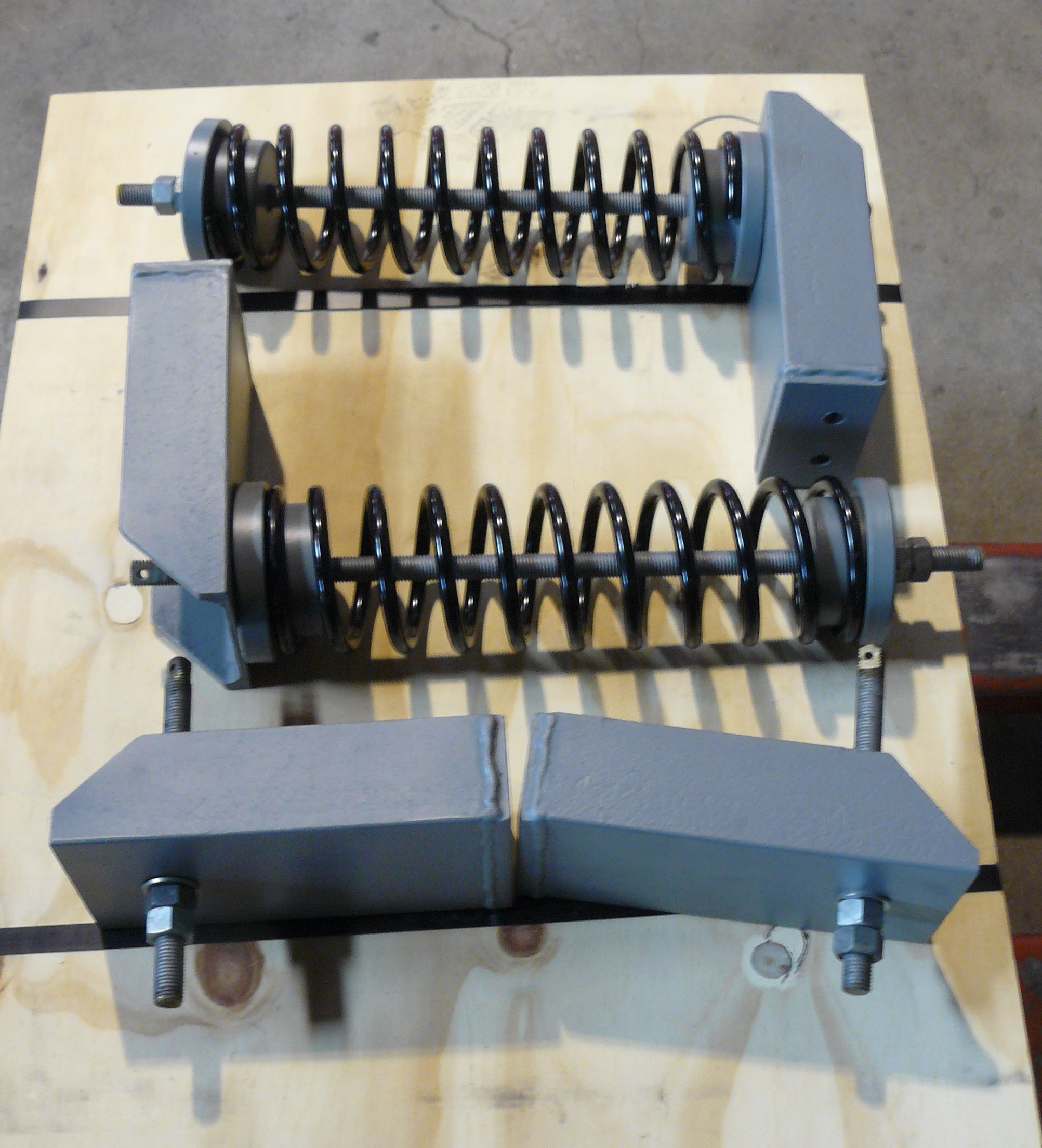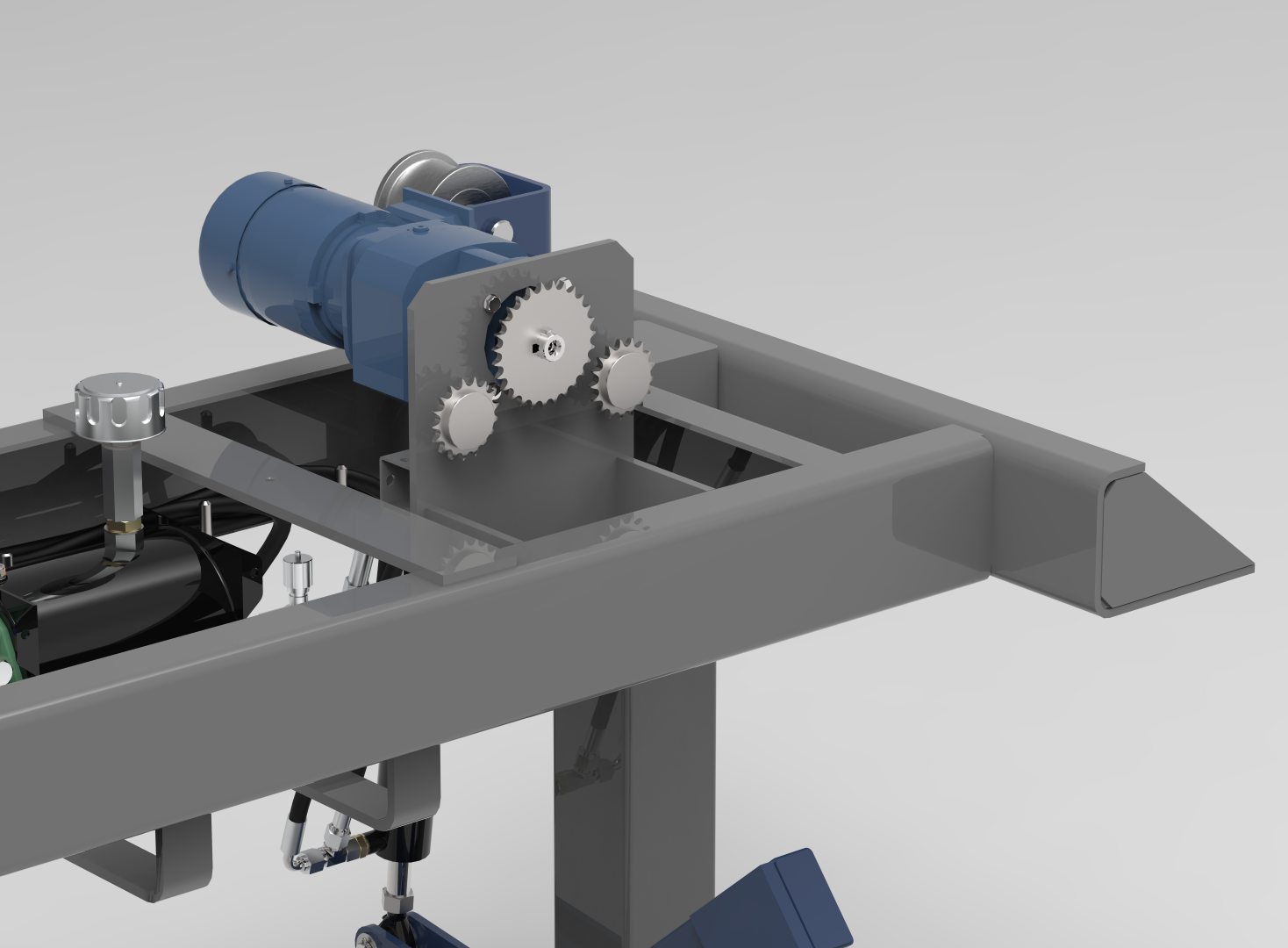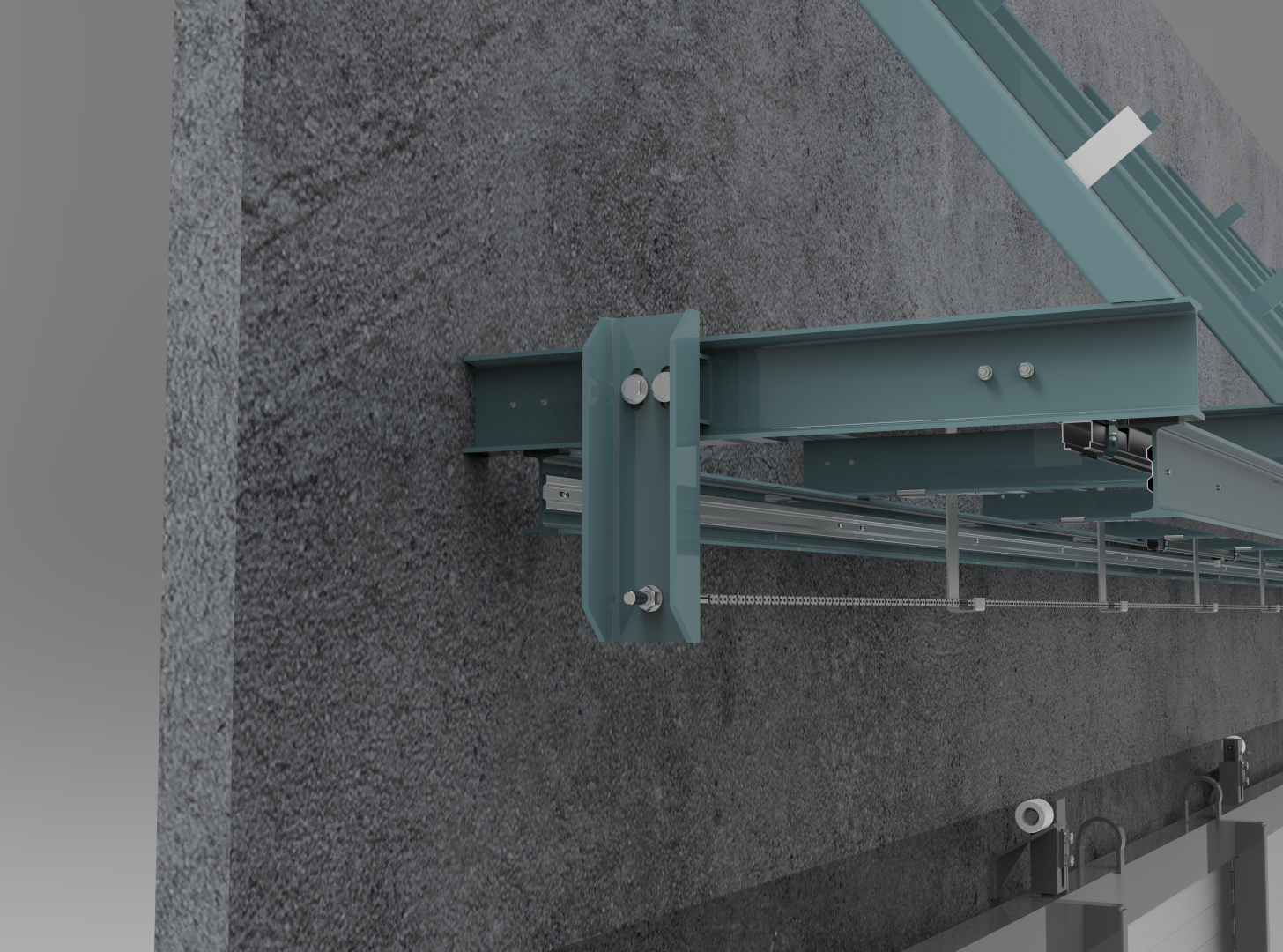 Här används en kedja från ena till den andra änden av rälssystemet där portlyftaren hänger. I ena änden är kedjans infästning ansluten till ett fjädrande kedjefäste och i den andra änden ett fast kedjefäste.