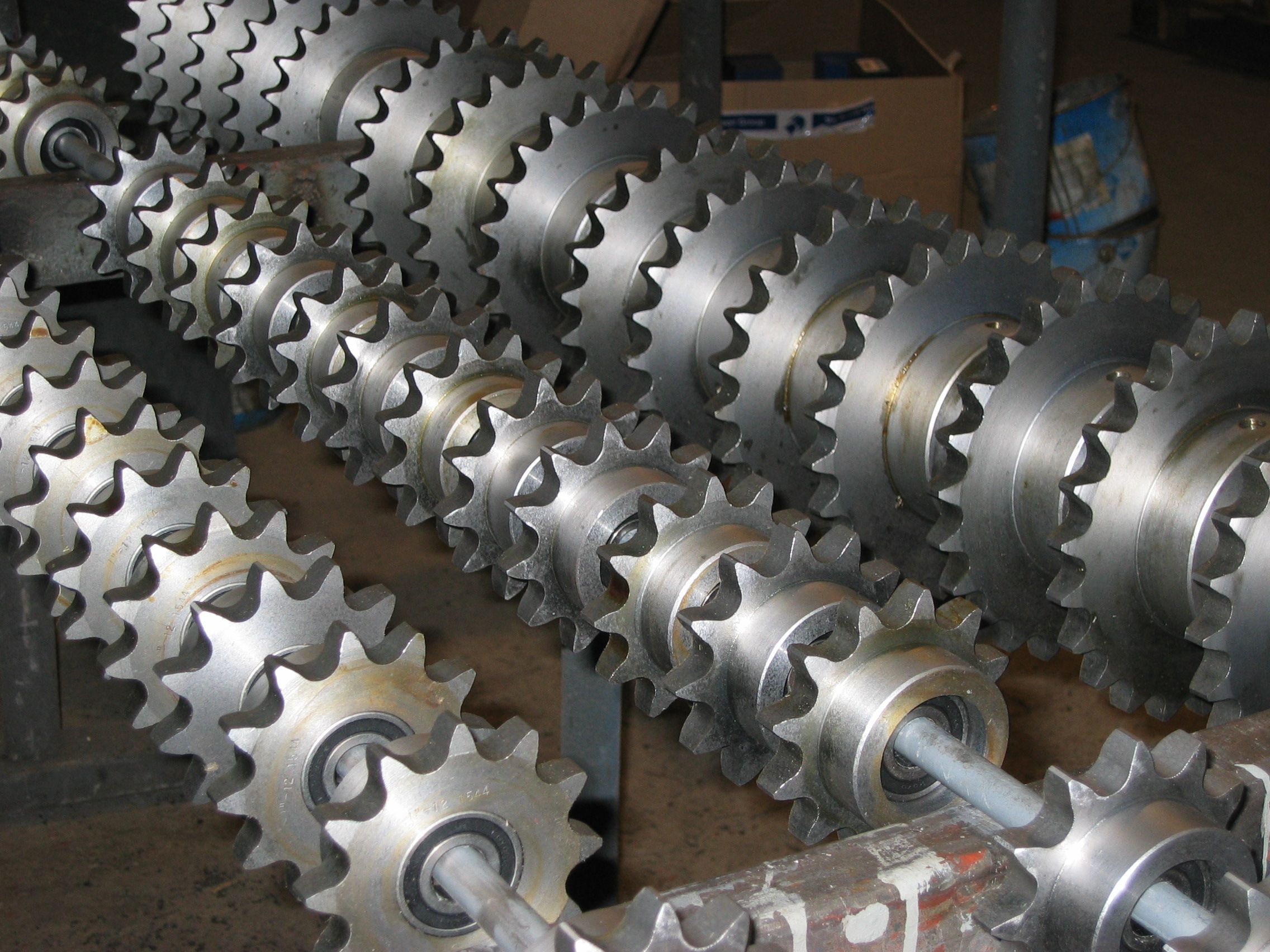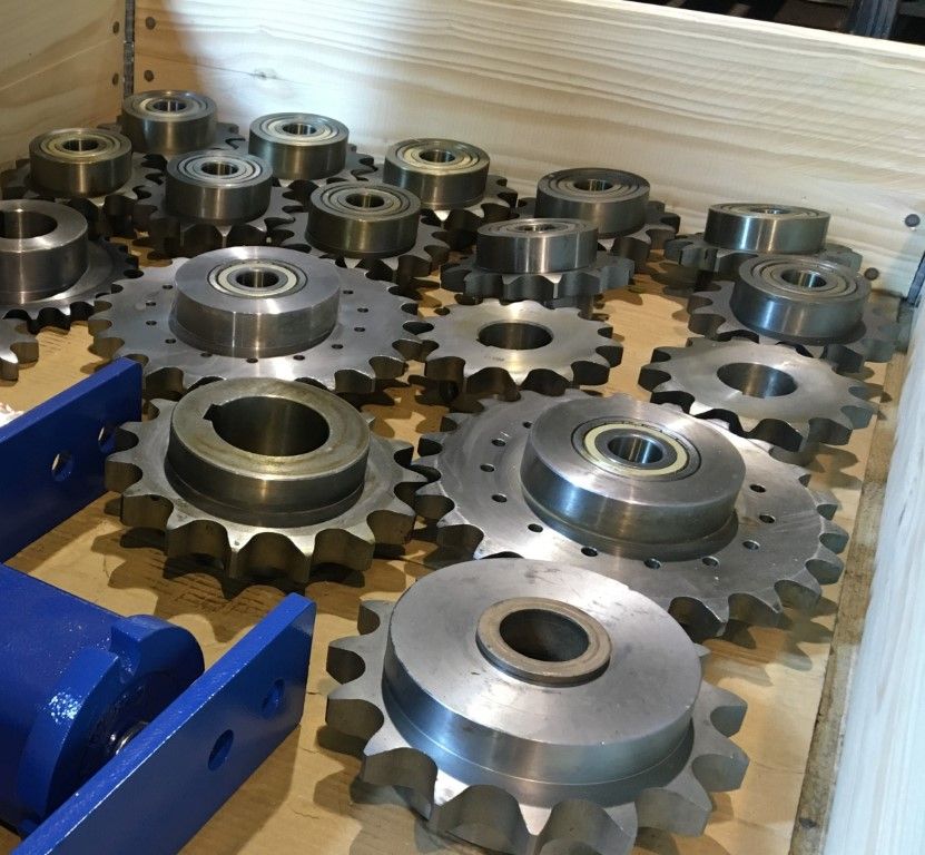 Åtskilliga modeller av kedjehjul använda för eldrivna växelsystem till virkestorkar