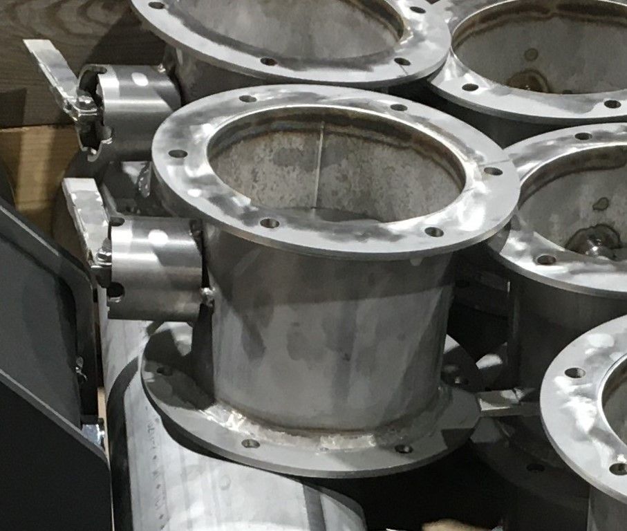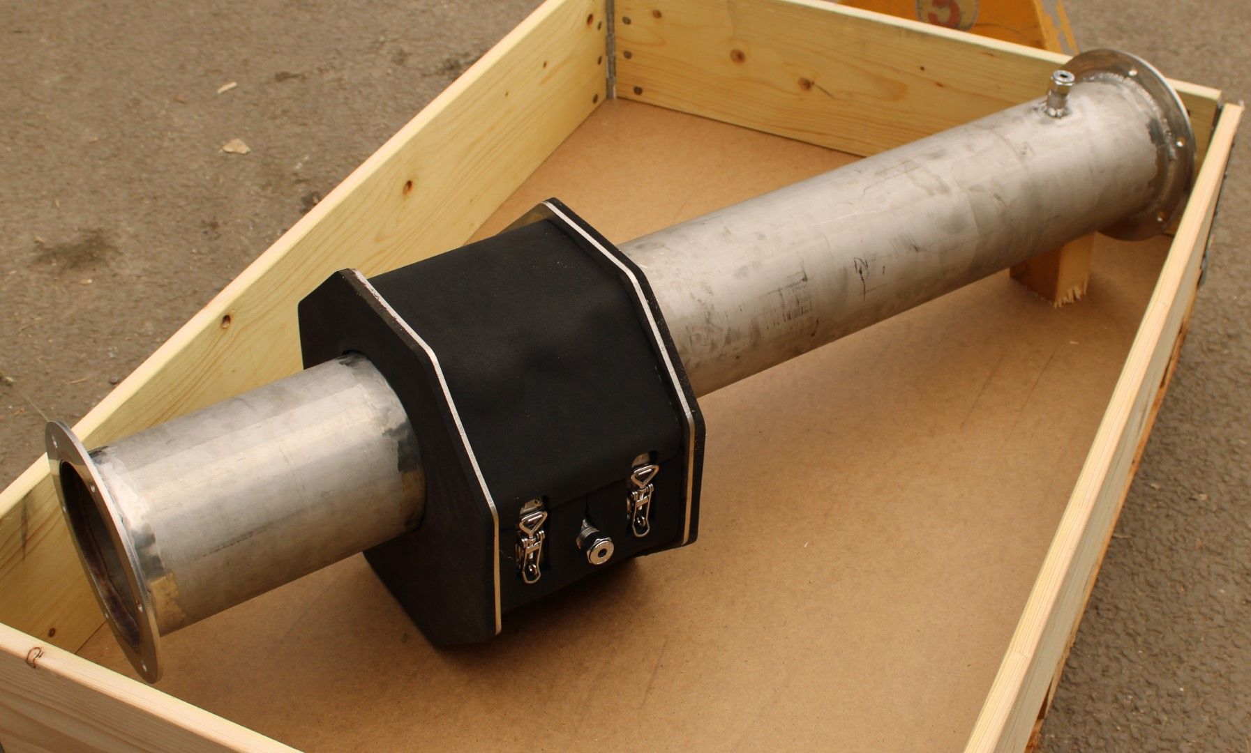 En termometer monteras i denna mättrumma och en psykrometerduk fästs över den. Nedanför termometern finns ett vattenbad som löpande fylls med vatten med ett lämpligt intervall. Mättrumman är isolerad men de anslutande grövre rören behöver isoleras på plats. De olika rördelarna har flänsar i ändarna som skruvas ihop. Vi har silikonpackningar som används mellan flänsarna som tätning.