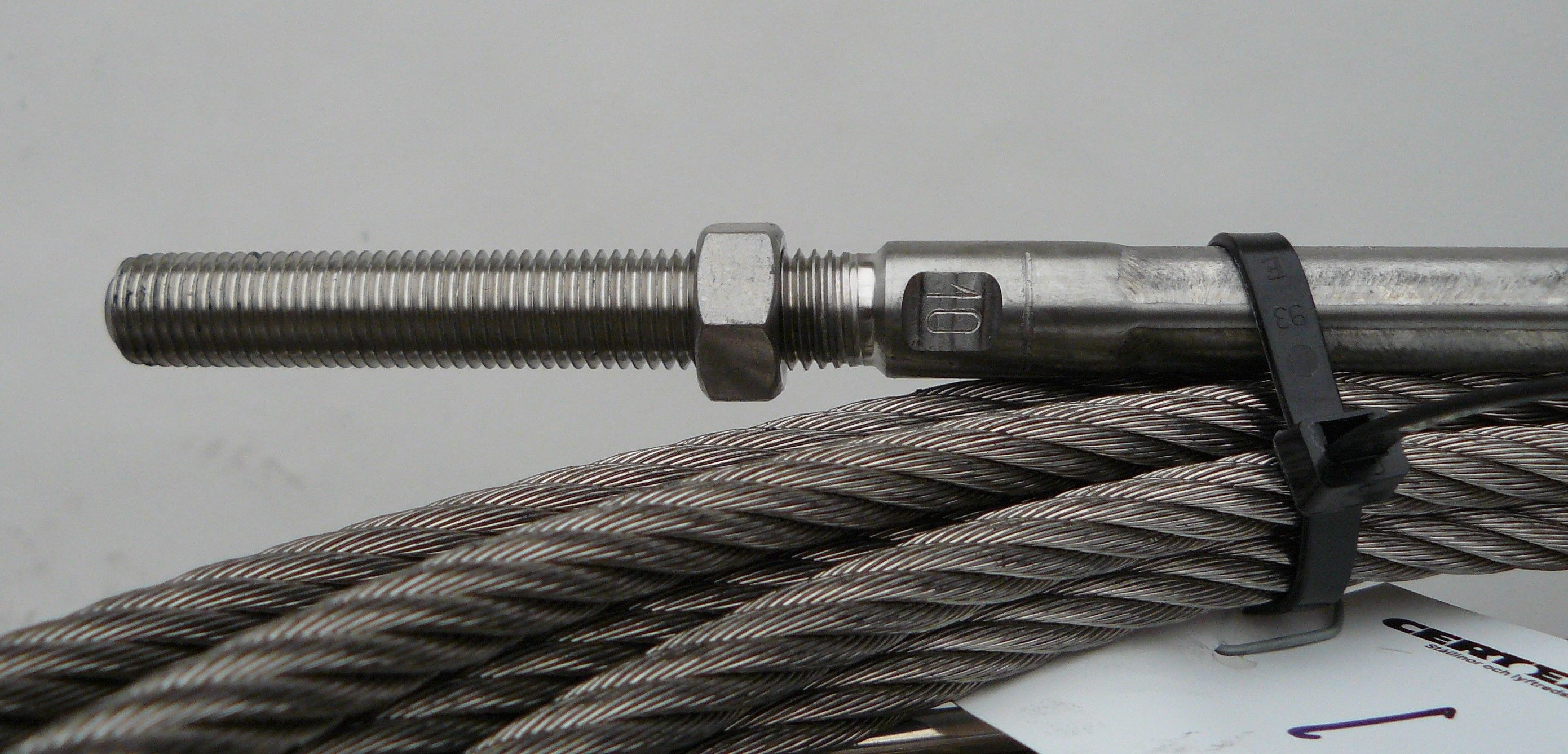 De vi tillverkar har en rostfri terminal med utvändig gänga och ett ändstopp i andra änden. Vi pressar båda ändarna själva och kan ofta leverera dem samma dag om vi får order senast kl. 11.00. Terminalen och wiren är rostfria och ändstoppet är tillverkat i en legering där koppar ingår.