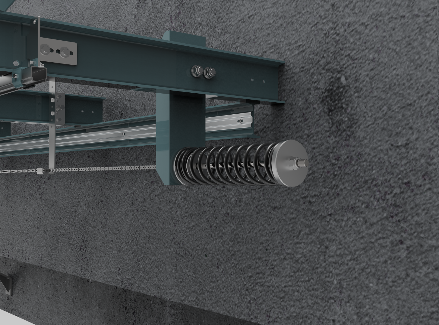 Här används en kedja från ena till den andra änden av rälssystemet där portlyftaren hänger. I ena änden är kedjans infästning ansluten till ett fjädrande kedjefäste och i den andra änden ett fast kedjefäste.