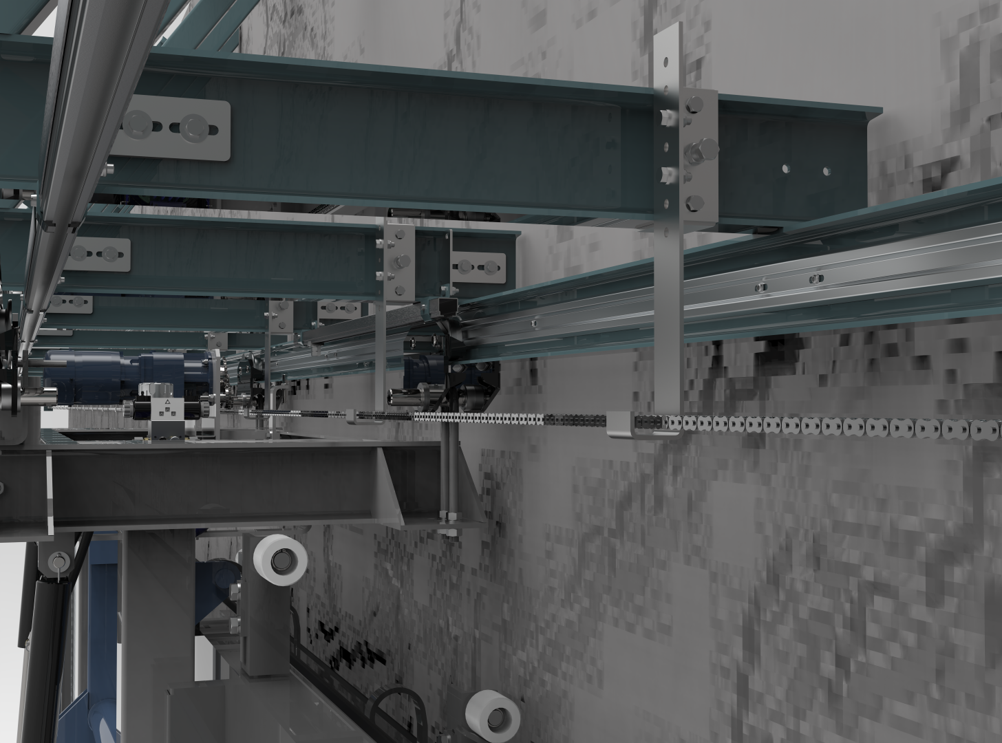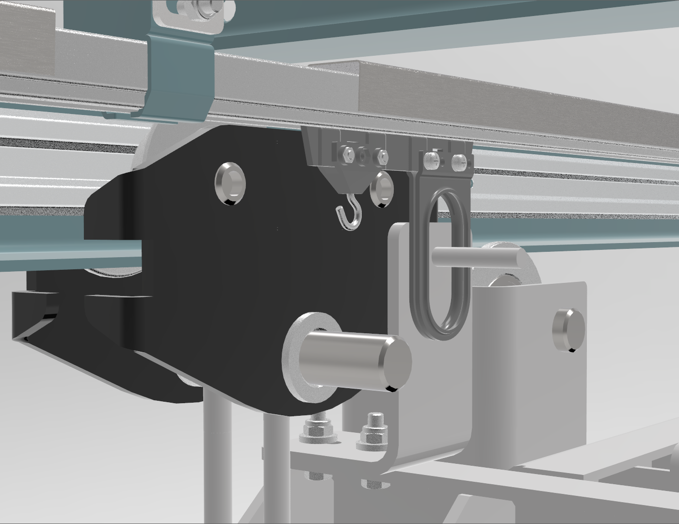 SST har utvecklat en kedjefångare som fästs på varje konsol som bär upp rälsen som porttransportören hänger i. Vi har en variant som passar till IPE100, en för IPE120 balk och en för HEA100 balk. Ifall kedjan någon gång går av kommer kedjan fastna i kedjefångare. Detta är en viktig åtgärd, för kedjan får en hög hastighet när den faller till marken och kan orsaka allvarlig personskada.