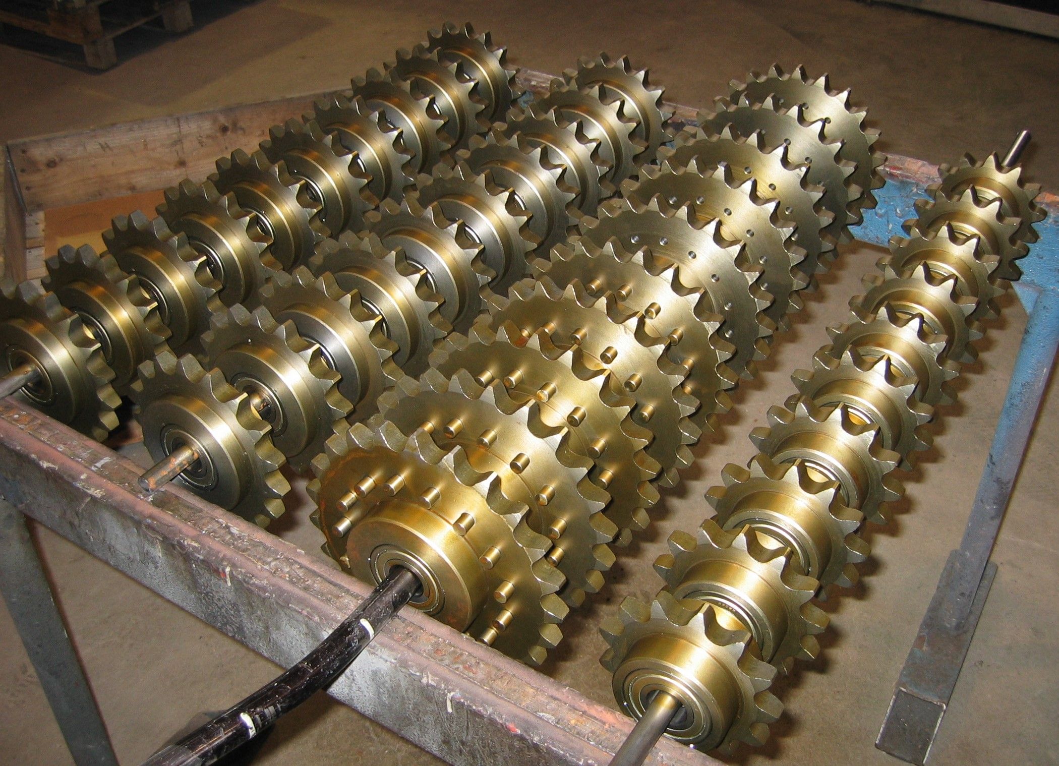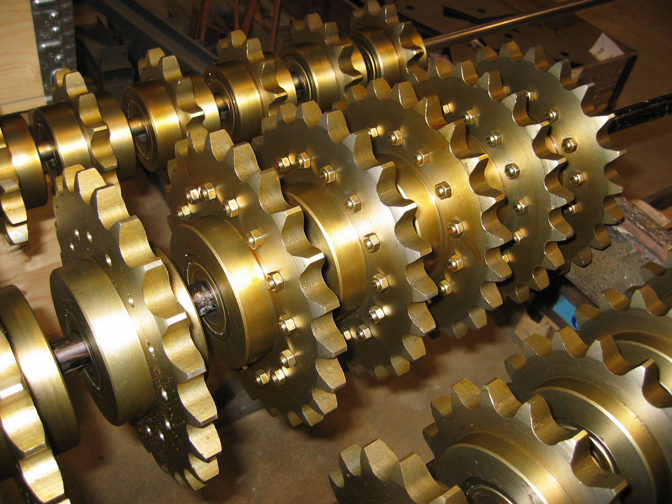 Åtskilliga modeller av kedjehjul använda för eldrivna växelsystem till virkestorkar